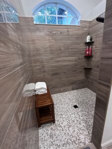 10 bathroom shower tile renovation Brooksville 8×48 Polished Catalina Teak rectified tile Calacatta Vecchia Penny tile ceramictec